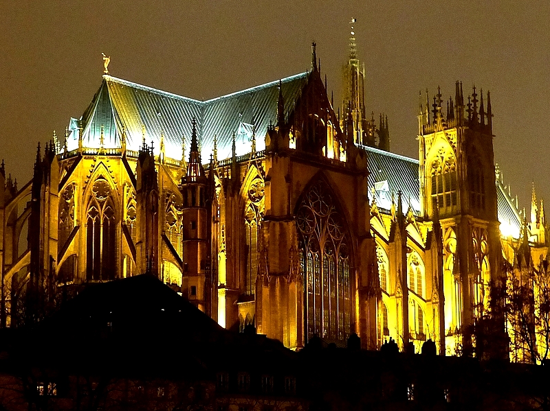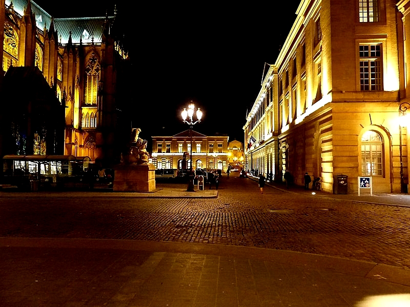 Nous ne sommes pas, cette fois, descendus au bord de la Moselle. Depuis la place de la Préfecture la cathédrale, comme elle l'est place d'Armes, est habillée d'or.