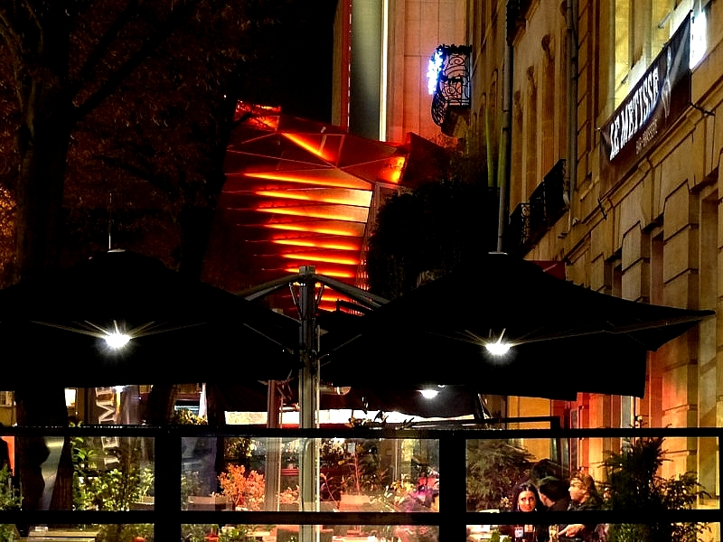 Alors que nous étions encore sur cette place, Evelyne a souhaité aller prendre des photos de nuit de la cathédrale. Je ne l'ai retardé que le temps de photographier la marquise rouge des Galeries Lafayette au dessus des terrasses chauffées.