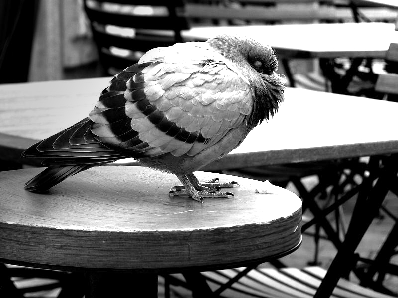 L'hiver, pigeon ne vole pas toujours. Parfois il dort sur une table de bistrot le plumage en cache-nez...