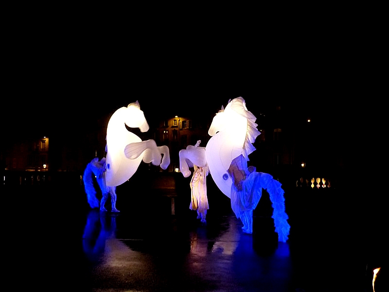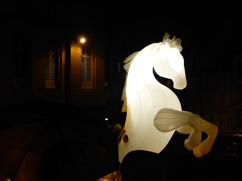 Avant celui de FierS à cheval, place d'Armes nous avons assisté à une partie d'un spectacle décalé et détrempé. J'y étais, nous y étions coincés dans une foule très dense protégée par des "millions" de parapluies très envahissants.