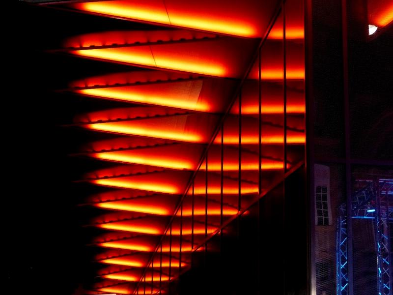 La marquise est constituée de panneaux de verre triangulaires rouges.