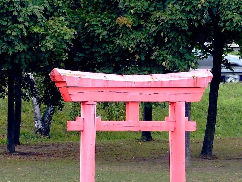 Le torii (minuscule au centre de cette photo), je l'ai photographié un moment plus tôt lorsque j'attendais le début de la manifestation. Au dessus des arbres, le Mont Saint-Quentin "la montagne de Metz" culmine à 358 mètres...
